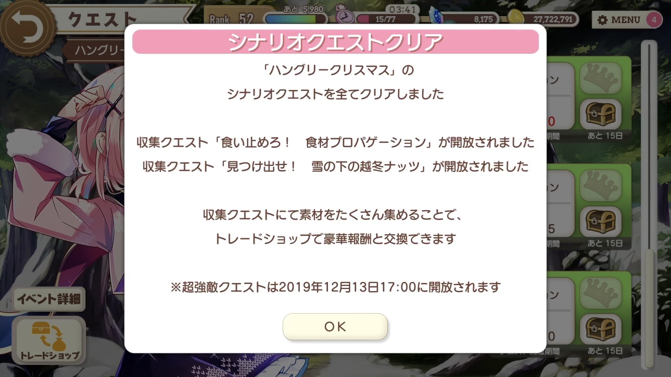 新クエスト『ハングリークリスマス』シナリオクエストクリア。