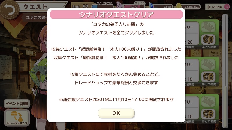 ユタカの弟子入り志願シナリオクエストクリアー。今回はより一層ラスボスに苦戦した。